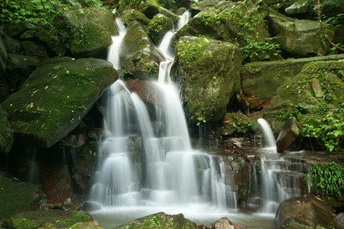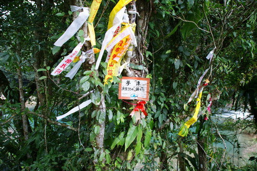 於15:27回古道續前行,就遇到滾滾溪水阻斷古道,需涉水而過,灣潭古道的另一項特色,是中間有零星的大小瀑布,於15:35至步道旁小瀑布: