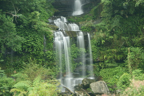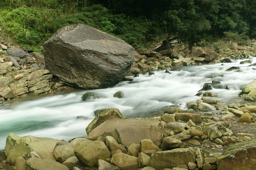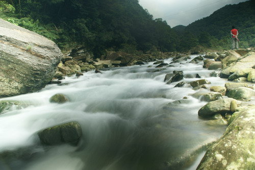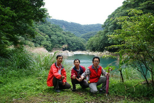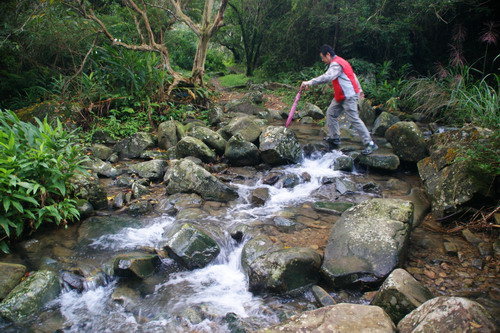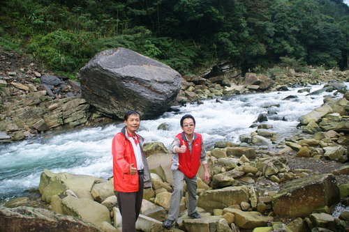 與同事合照之後,其中一位同事想續行至古道終點,我則與一位同事於此坐溪石,觀流水山景,欣賞溪瀑流水之美: