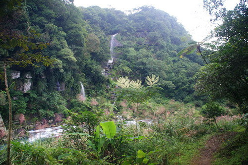 於15:45至山峰上懸掛兩道瀑布,有如白楊瀑布,而此時我同事已走至終點折回至此相遇,我們則走至這裡休息一下,怕續行會摸黑,就從此折返: