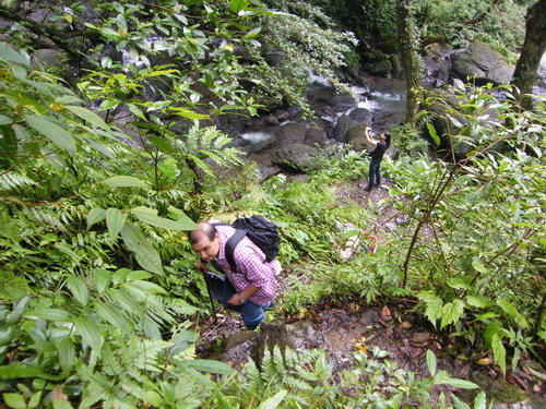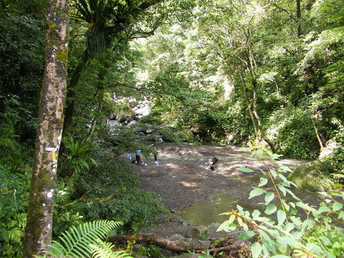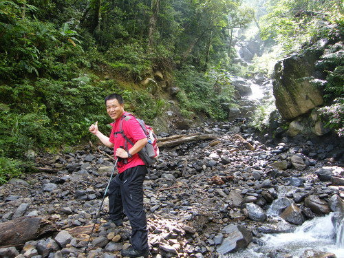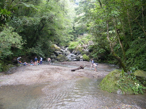 續前行陡上山徑會往組合山與滿月圓,但我們今日志在探訪瀑布,不再登峰攻頂,因此走到此就原地折返,於12:18回至戲水區,碰到於登山口相遇溯溪遊客,正於此休息: