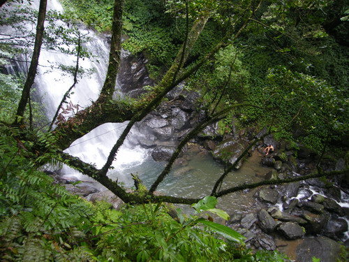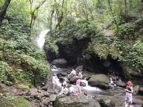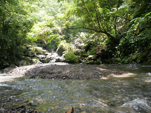 繼續沿著小徑溪岸往上走,遇岔路,走右岔路往溪谷,於11:58看到一群遊客在瀑布下游溪谷戲水,而右前方應是森山瀑布,看起來比雲心瀑布小了很多,高約一、二層樓而已: