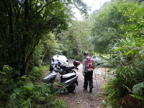 由於產道不易會車,此處山友養成默契,中午之前只能上行,中午之後只能下行,就可避開會車問題,因此我們續開車上行,少踢這1.6公里 產道,於09:15至登山口旁停車場,甚好停車,可停五、六輛沒問題: