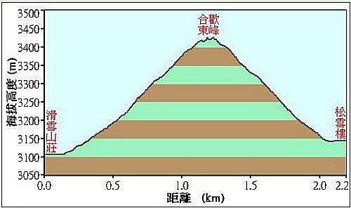 合歡東峰(H 3421M )至松雪樓(H 3150M ),約38分,997M