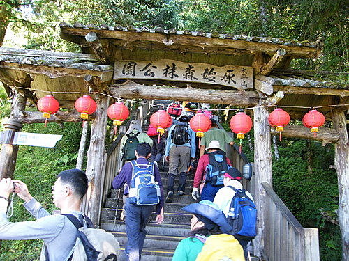 08:40經太平山原始森林公園木造牌坊,浩浩蕩蕩一行18人,吸引遊客注目: