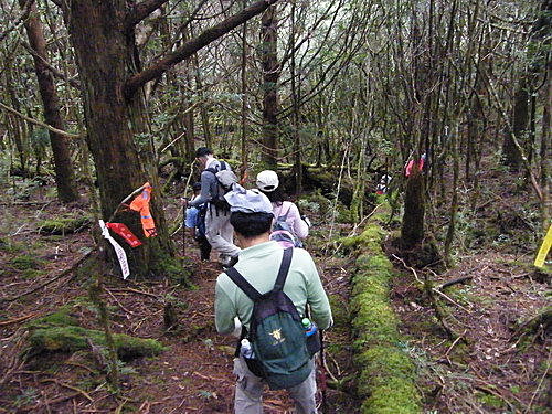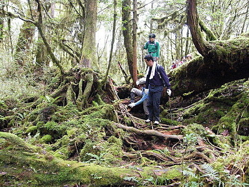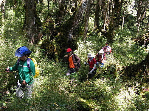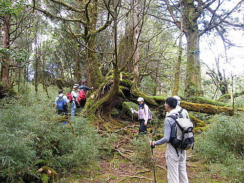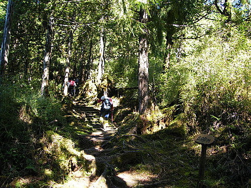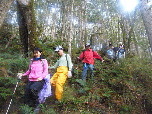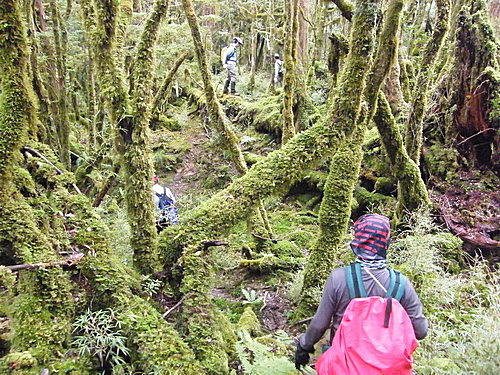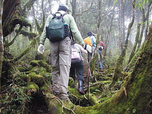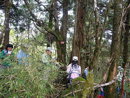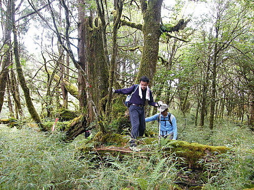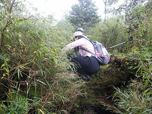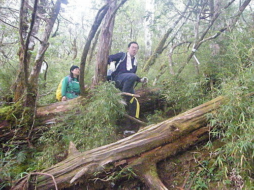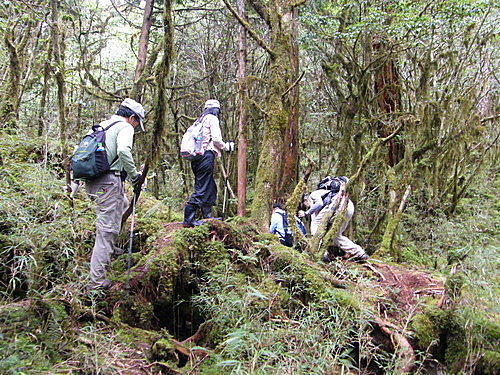 崩塌路況通過後,山路再轉原始林徑,林木蒼鬱,更為原始,有如走入侏儸紀森林,不少樹幹披上一層青苔綠衣,橫臥倒木甚多,且相當濕滑,在這段陡上又陡下路上,我竟然在跨越橫木時大腿抽筋了,領隊教我吃點鹽巴,也感謝領隊給我一顆藥丸吃,狀況改善很多了,可以繼續往前行: