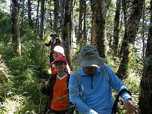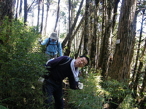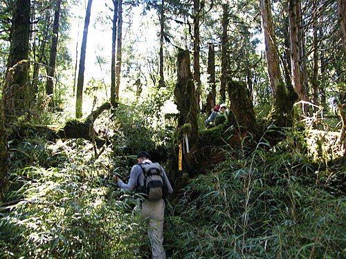 此後走入原始森林,山徑甚為原始不好走,還好沿路山徑路條不缺,循著路條前進,就這樣一路不是攀木跨行,就是穿越高大茂密箭竹林與芒草,甚至須走入泥濘路中奮勇邁進,真的沒想像中好走,很辛苦: