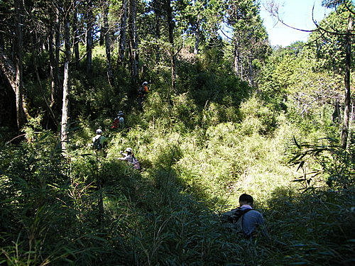 與後面同事無線電聯繫,說其迷路了,還好後來有找到路,大家到齊後於11:28再出發,此時山路轉下暫時擺說高密箭竹林之擾: