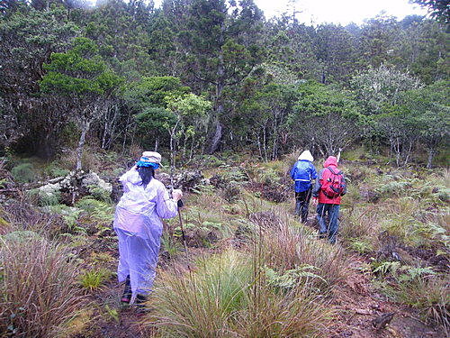 後面路況大致相同,不是跨不完的橫臥倒木,就是穿越高大茂密劍竹林與芒草,約於15:10時竟下起午後雷陣雨,來得又快又急又大,同事們趕緊穿起雨衣,地面又變得積水泥濘不堪難行: