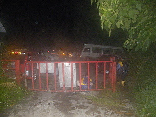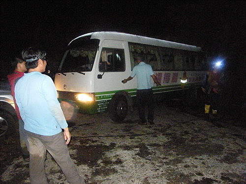 林道柵欄處空地停滿車,中巴上來接駁時,無法迴車,動彈不得,最後集眾人之力,再加司機精湛演出,終使中巴脫困迴車,大家拍手慶賀終於可回家了。