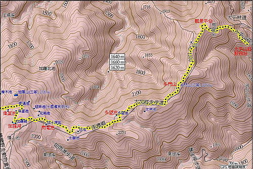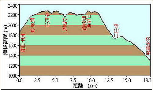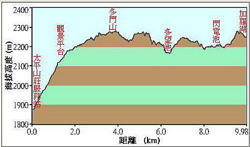 太平山莊服務站(H 1890M )至加羅湖(H 2248M ),約7小時50分,9.8KM