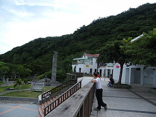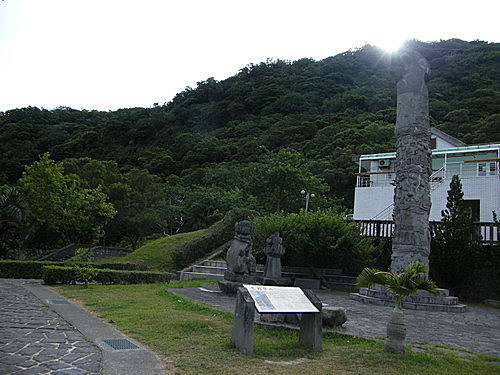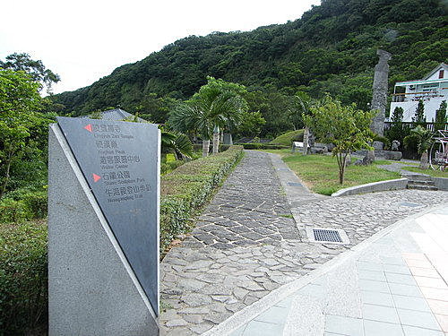 面向『遊客中心』的左側有一圓柱型很高、很醒目的石雕(龍的傳人),『牛港稜登山步道』指標於此可看到: