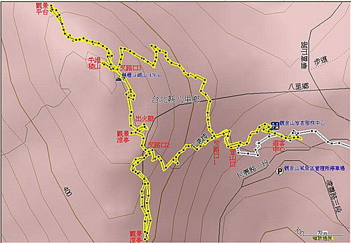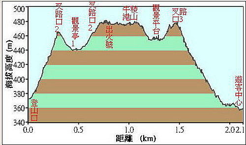遊客中心登山口(H 372M )至觀景亭2及出火號(H 478M ),約24分,746M