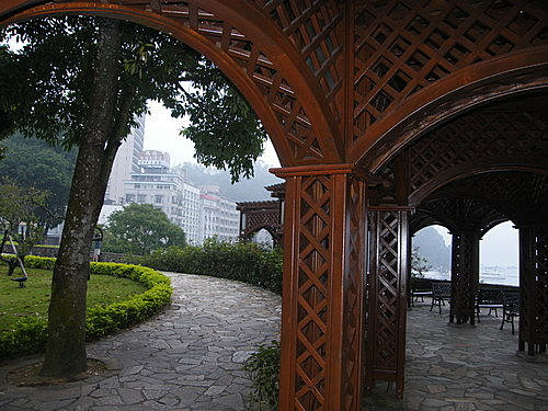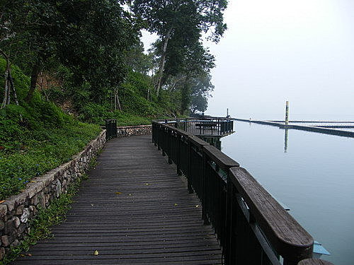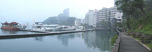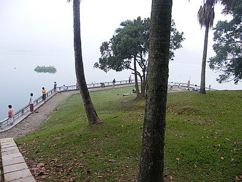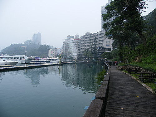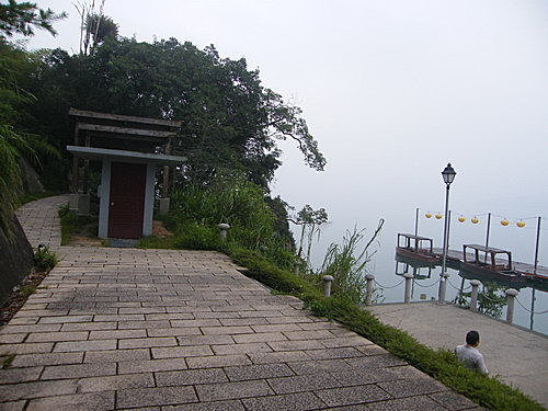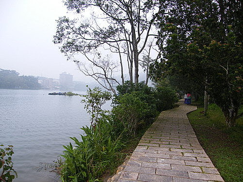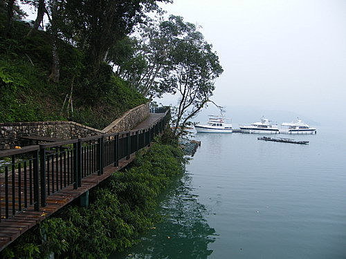 紀錄:日月潭健行步道計有猫囒山自然步道、後尖山步道、青龍山步道、水社大山步道、涵碧步道、水社親水步道、內湖山步道、年梯步道、松柏崙步道、大竹湖步道、水蛙頭步道、伊達邵親水步道、土亭仔步道、慈恩塔步道及月潭步道等,很多步道皆要豋山,再加上一日時間不夠,何況家人難得跟我出來玩,對登山沒興趣,只好找有特色慈恩塔步道走走,而旅店附近涵碧步道與水社親水步道,我只好利用家人還在夢鄉中,於上午05:30起來至此步道走走,想拍些日月潭晨曦之美,然今日水氣太多,湖面山景霧矇矓,沒有藍天白雲,青山綠水,所以拍起來景色不盡如意。