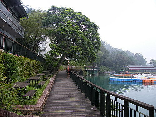 沿這木棧道行走可臨水賞景,並可遠眺水社大山及西巒大山等群山之美,然今日晨霧太重,連近處青龍山脈與拉魯島都無法看到:
