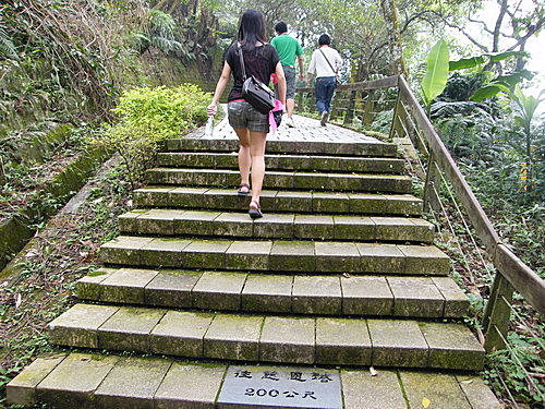 慈恩塔步道用石階鋪設而成,只有開剛始較陡,之後大部分皆是Z字型平緩好走步道,石階上每隔100公尺會標示往慈恩塔還有幾公尺: