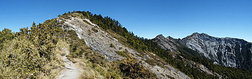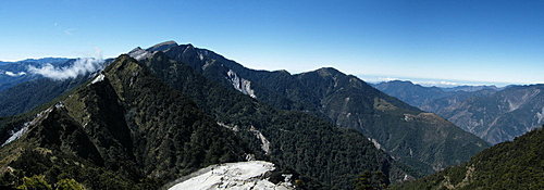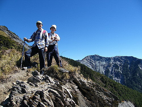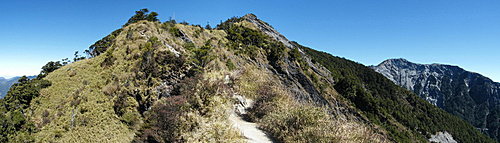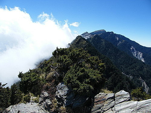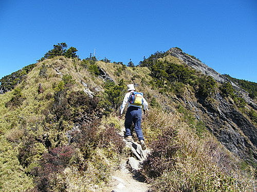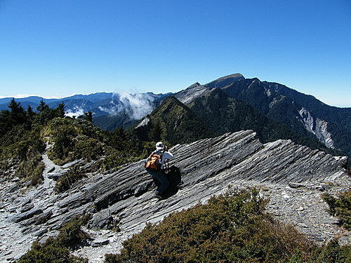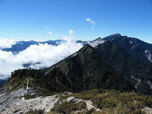 續行,會有數段拉繩陡上,沿途視野超好,可看到塔關山,鷹仔嘴山,關山北峰,關山,庫哈諾辛山及向陽山,幾乎都是3000M以上高山,走碎石坡或頁岩坡時,仰望關山嶺山,山勢崢嶸: