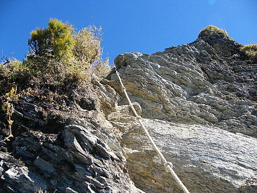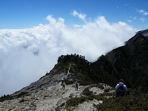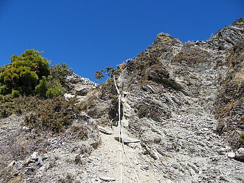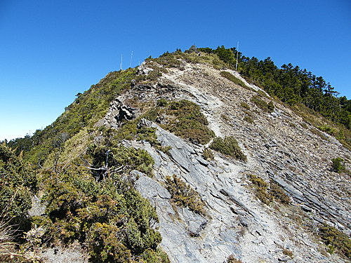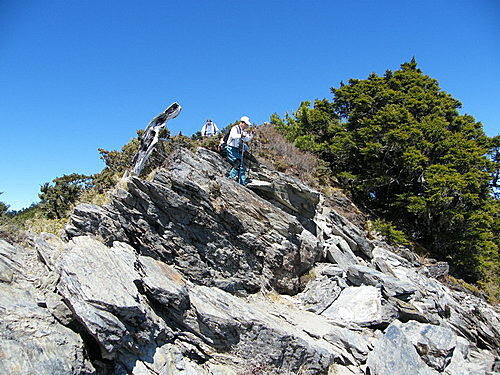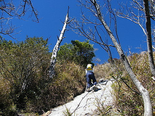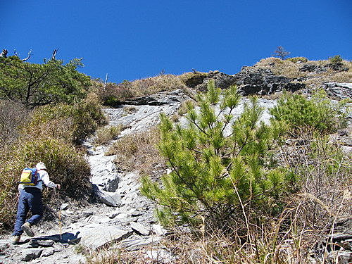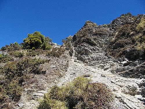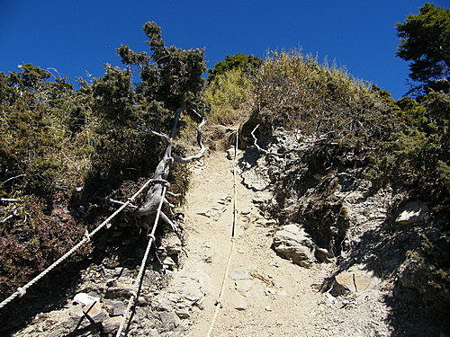 一開始就陡上,有小架梯及拉繩,一路都是石頁岩,蠻滑的,接著有二面大峭壁,都是頁岩地形,要注意落石: