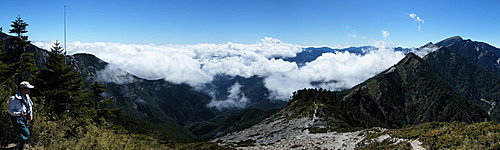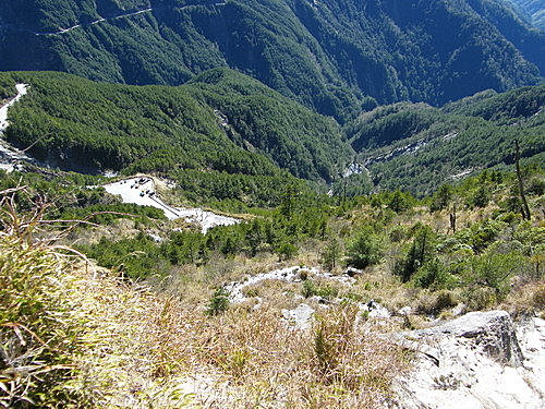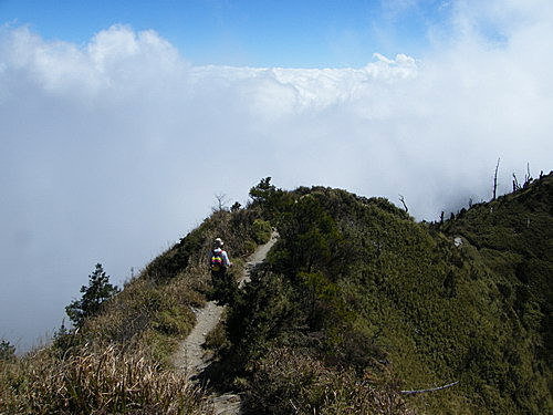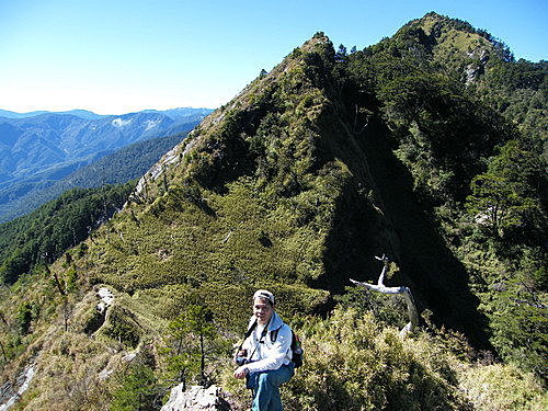 於10:22上至稜線,往下看可看到南橫公路及大關山隧道登山口,然稜線大部分為窄稜,曾在此發生山難,需小心行走: