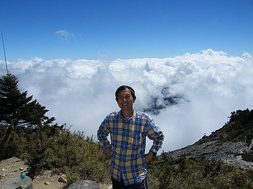 於11:26登頂關山嶺山,山頂箭竹冷杉環繞,另有氣象測候裝置。視野超佳,今日雲海變化萬千,氣勢澎湃,台東縣雲海就是過不了關山山嶺至高雄縣,真是美麗極了;第一次登上百岳,大家紛紛打電話跟太太告知一下,分享此份喜悅,最後大家在此合照留念: