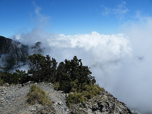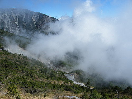 於13:24行至稜線終點,開始陡下,於13:41返回登山口,此時埡口隧道前已雲霧繚繞,無法看出雲海,必須明日一大早,氣溫較低,雲海就可出現: