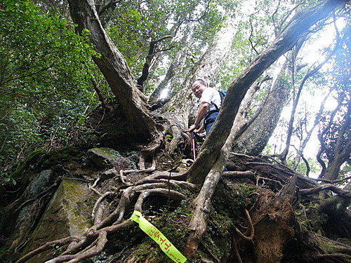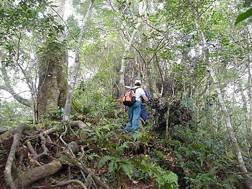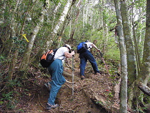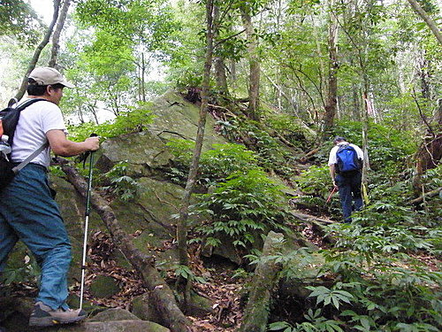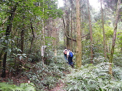 接著是一片柳杉林與窄稜岩石坡,一路陡升,走起路來備感吃力: