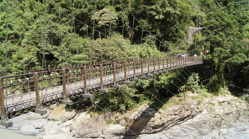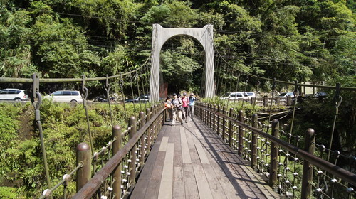 信賢步道從前是烏來與福山之間的聯絡道路,路口有一座跨越南勢溪的黑色吊橋─信賢吊橋,終點是信賢種籽親子實小。我們從此邁開今日瀑布之旅,步道平坦好走,沿路瀑布、溪澗甚多,且大都在林蔭下,走來相當有山林風情,吸收大自然芬多精,讓人身心舒暢: