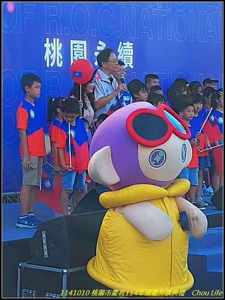 今天的確晴空萬里、大地含笑,於08:50迎接國旗入場,並唱國歌與升旗,隨後桃園張市長致詞,祝中華民國生日快樂: